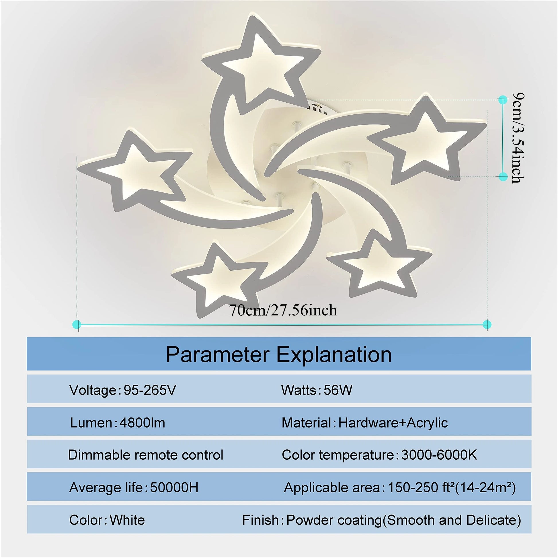 Diameter: 70cm. Height: 9cm. Lamp holder: 5 lamp caps. Power: 60W. Voltage: 85-265V. Modern led ceiling light using metal and white acrylic lampshade, resistant to corrosion, not easy to fade and good light transmission.